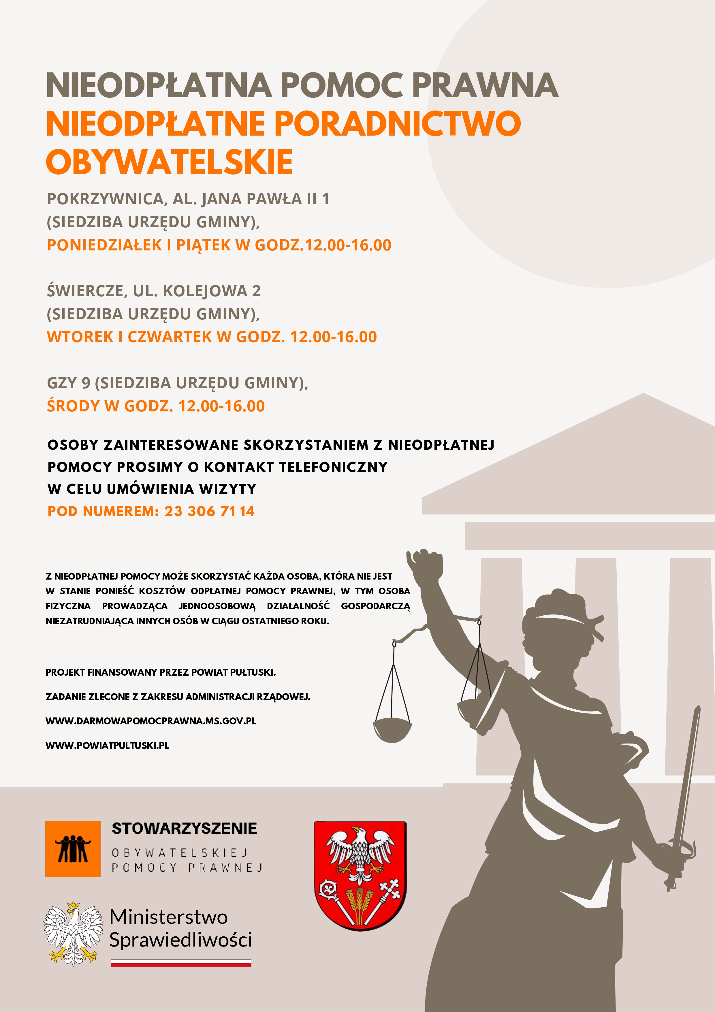 Zapisy na porady prawne - od poniedziałku do piątku w Starostwie Powiatowym w Pułtusku pod numerem telefonu 23 306 71 14